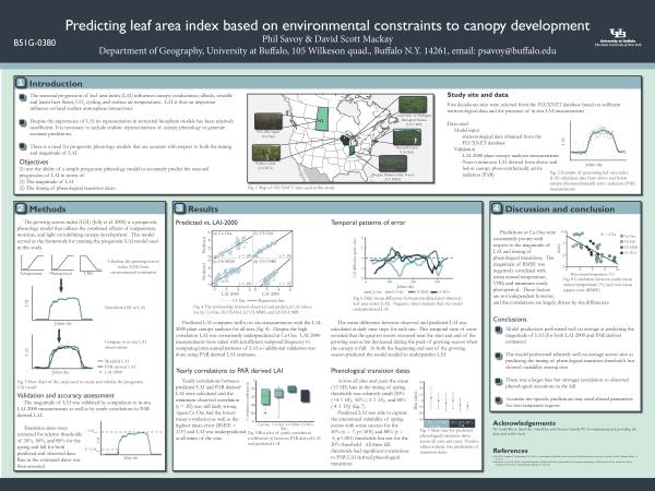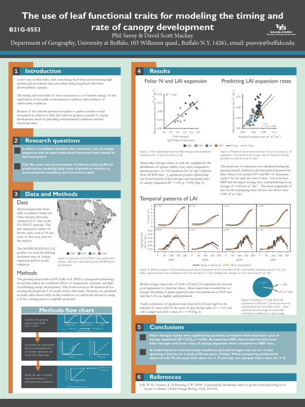 PostersConference postersAGU 2013Terrestrial phenologyPredicting leaf area index based on environmental constraints to canopy developmentAGU 2015Terrestrial phenologyThe use of leaf functional traits for modeling the timing and rate of canopy developmentNSF Macrosystems meetingStream metabolismThe StreamPULSE projectAuthorPhilip Savoy