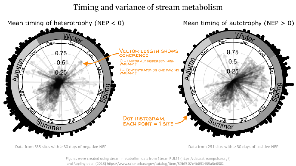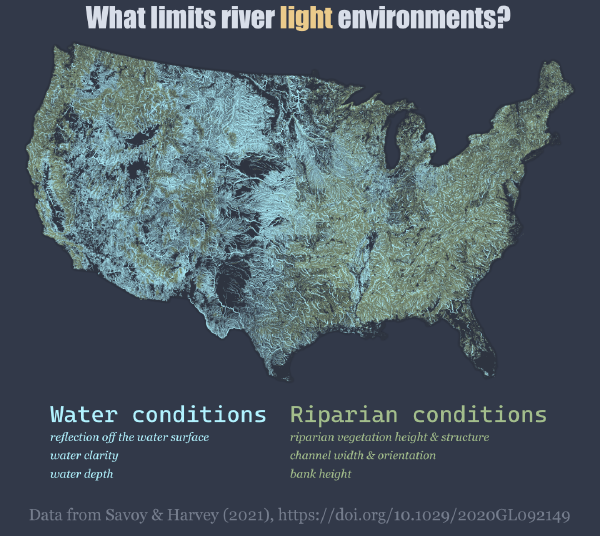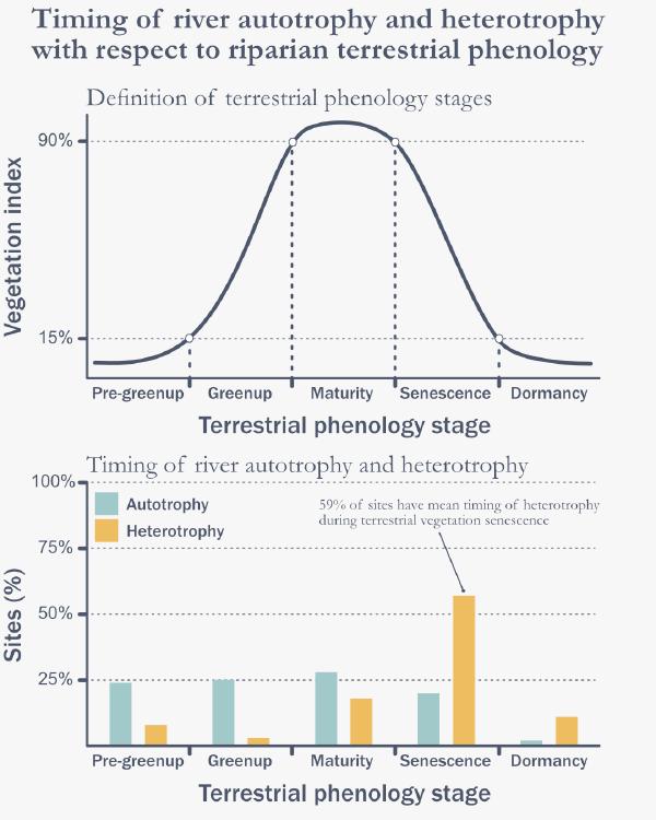The combined effects of the creation and dissipation of organic energy are referred to as ecosystem metabolism. We quantify these in terms of rates of gross primary productivity (GPP) and ecosystem respiration (ER). Just like in terrestrial systems, productivity is limited by a combination of light, nutrients, and temperature. However, rivers can also experience frequent and intense disturbance and their function can be highly influenced by local conditions in the surrounding riparian area.